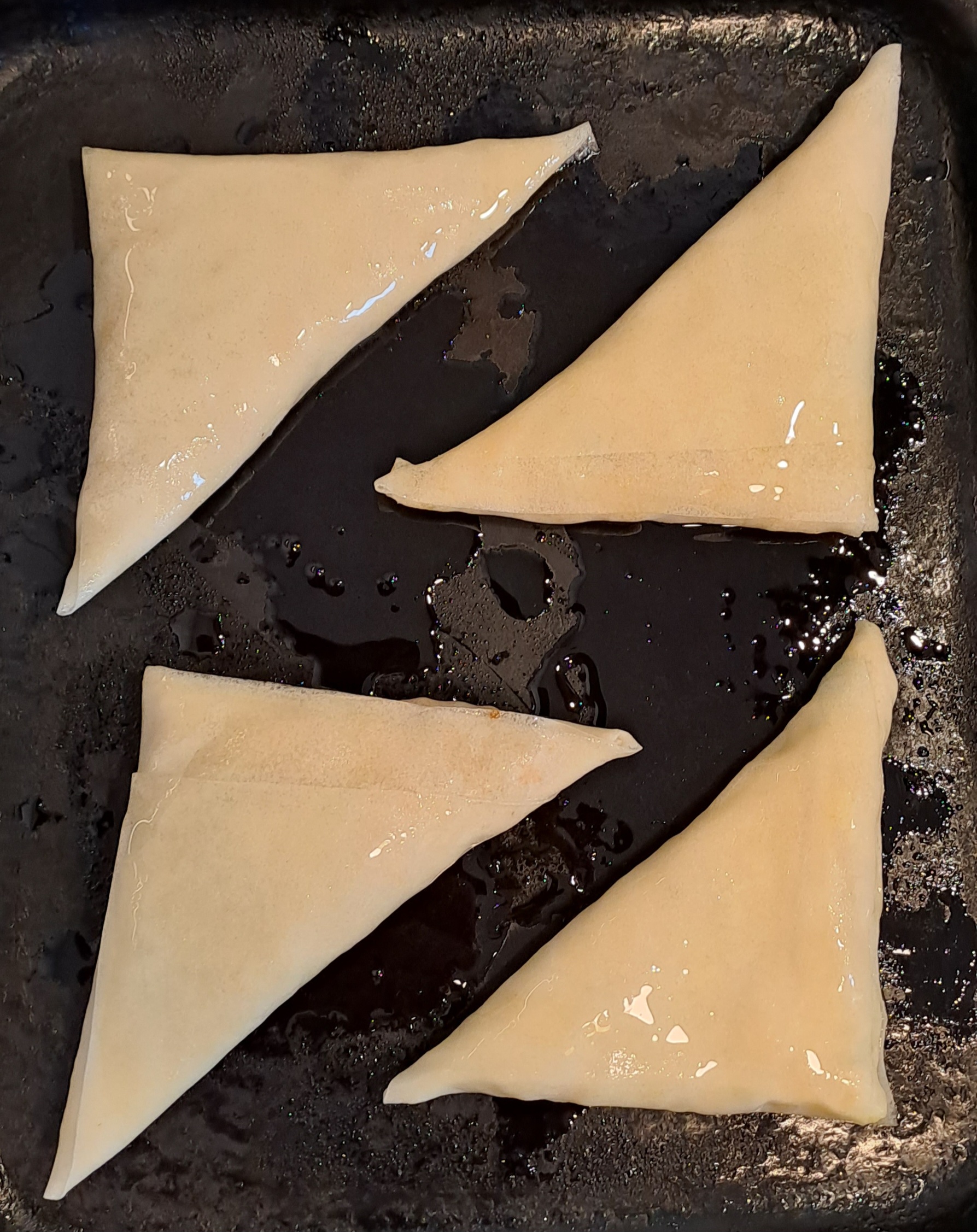 Coat each samosa with a little oil (you can rub each one with your hands) and place on a baking tray.