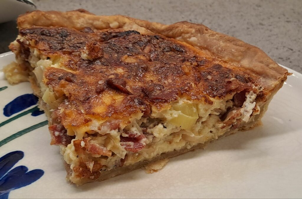 Add the grated cheese to the bottom of the pastry shell. Top with the onion and leek, and fried bacon.Â