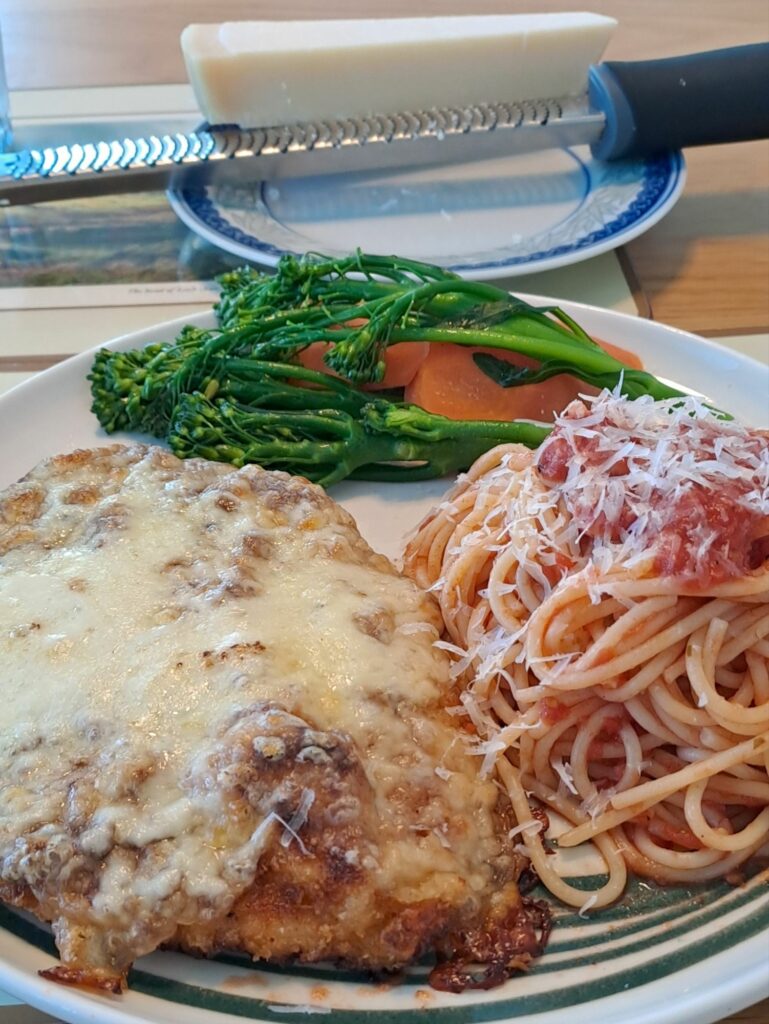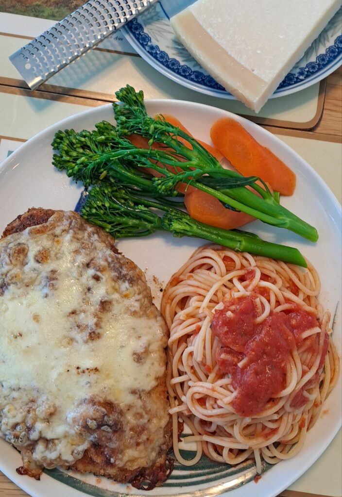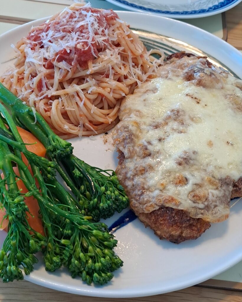 Chicken parm is the ultimate comfort food. Traditionally this dish is fried chicken topped with tomato marinara sauce and mozzarella baked in the oven to a gooey crunchy delicious treat. For this recipe, the tomato sauce is left out, and instead it is served with tomato sauce spaghetti – I feel the extra sauce on the parm is unnecessary.
