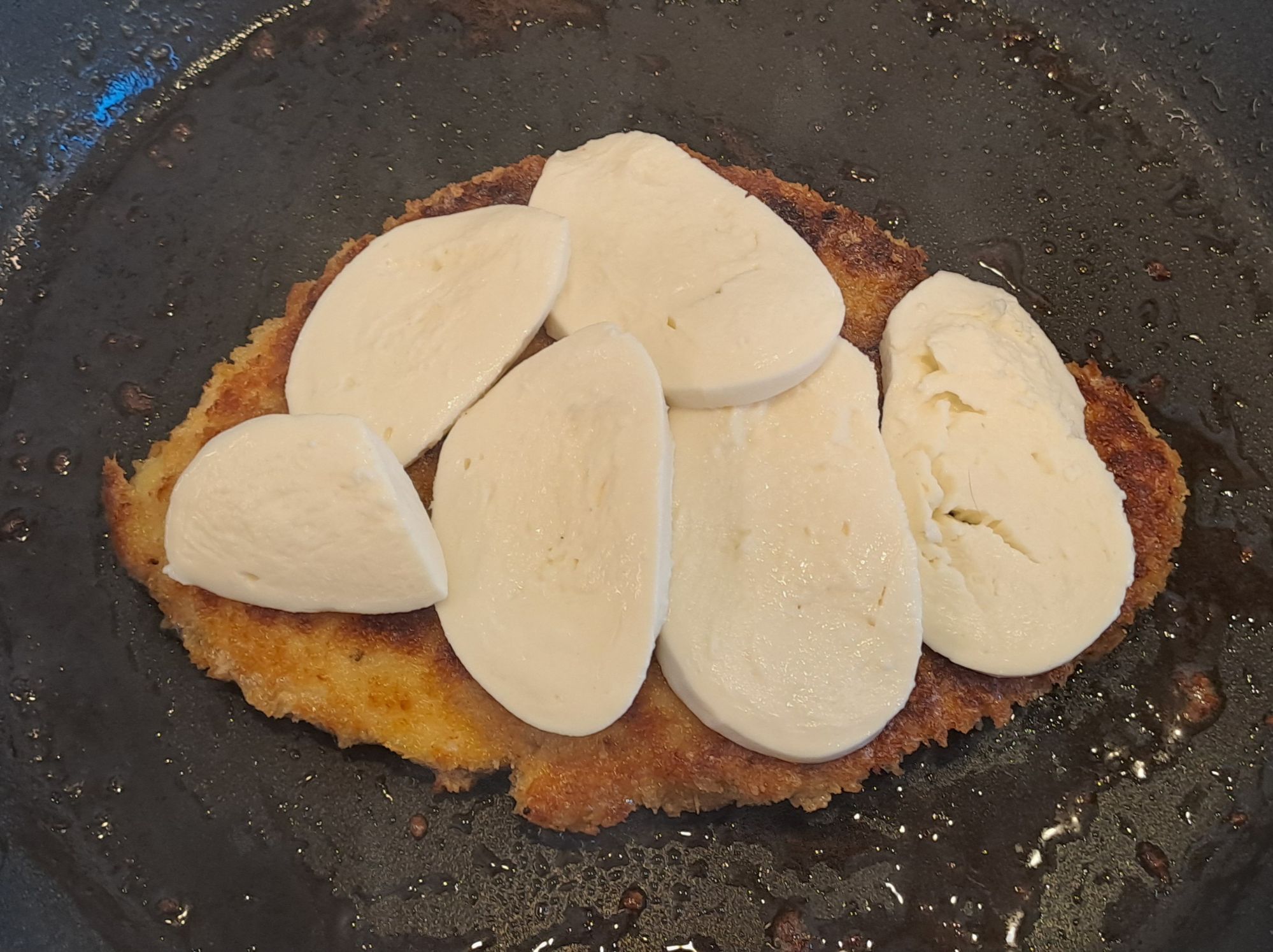 Place slices of fresh mozzarella on the browned chicken breast halves.Â