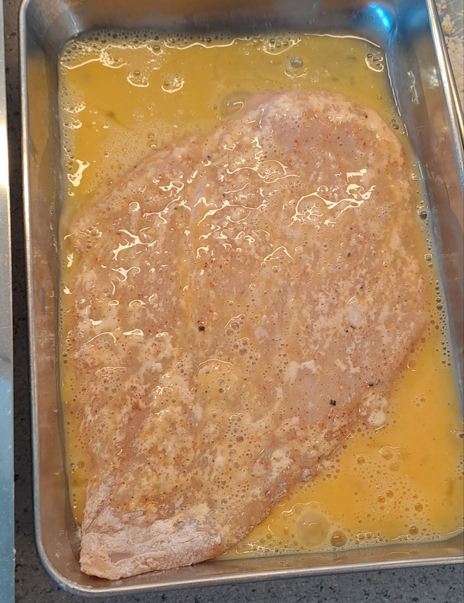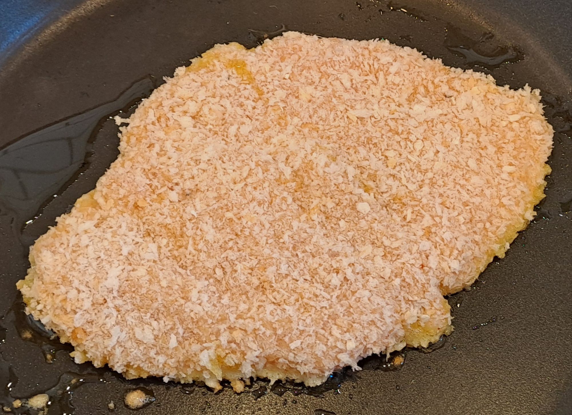 Let the breadcrumbed chicken rest in the fridge for 15-30 minutes.