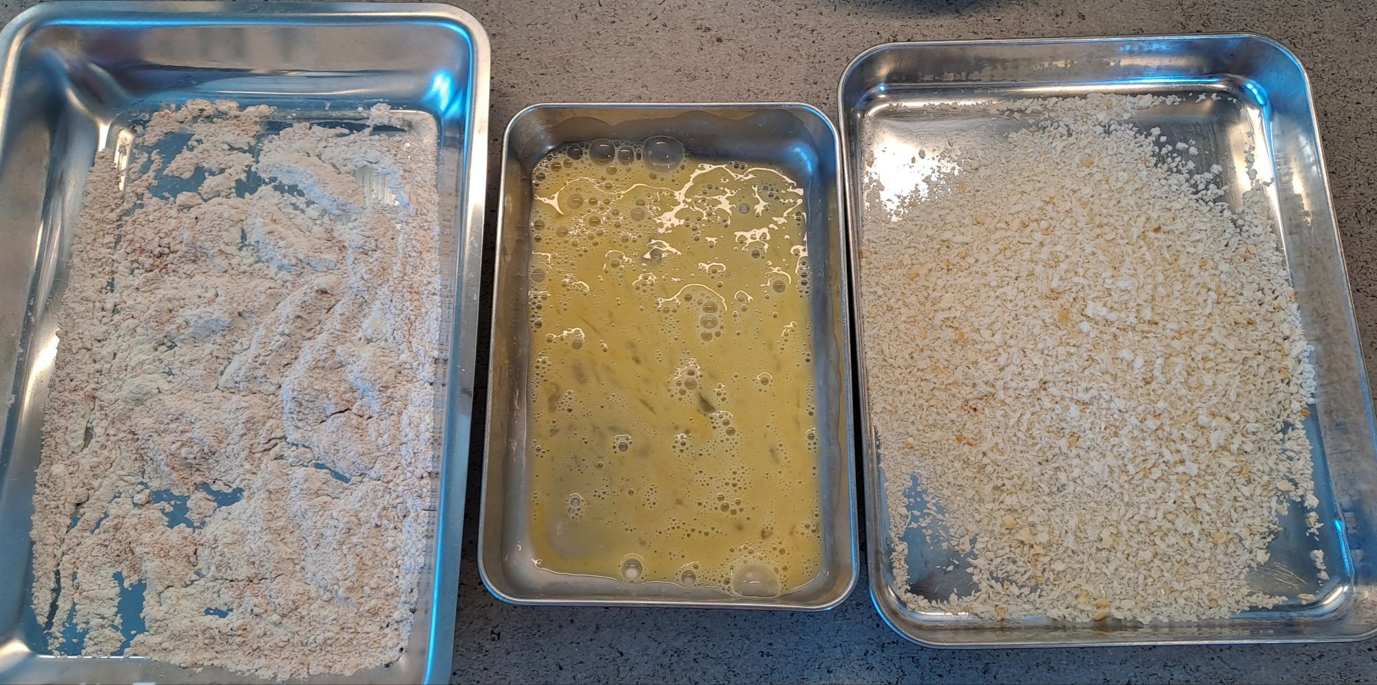 Take 2 more trays and add the beaten egg to one and the breadcrumbs to the other.Â