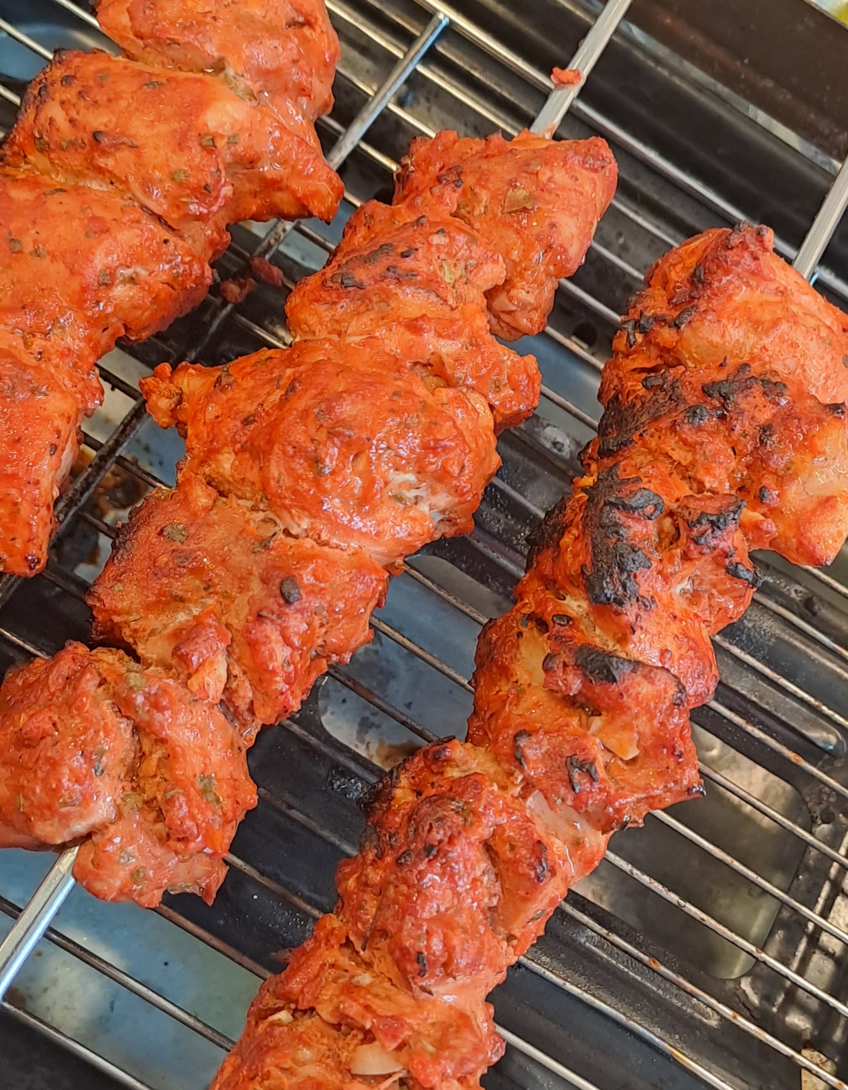 The chicken tikka kebabs are best grilled over a flame – either gas or charcoal. If this is not possible they can be cooked in the oven. If you have a kitchen torch you can really develop some nice charred areas.