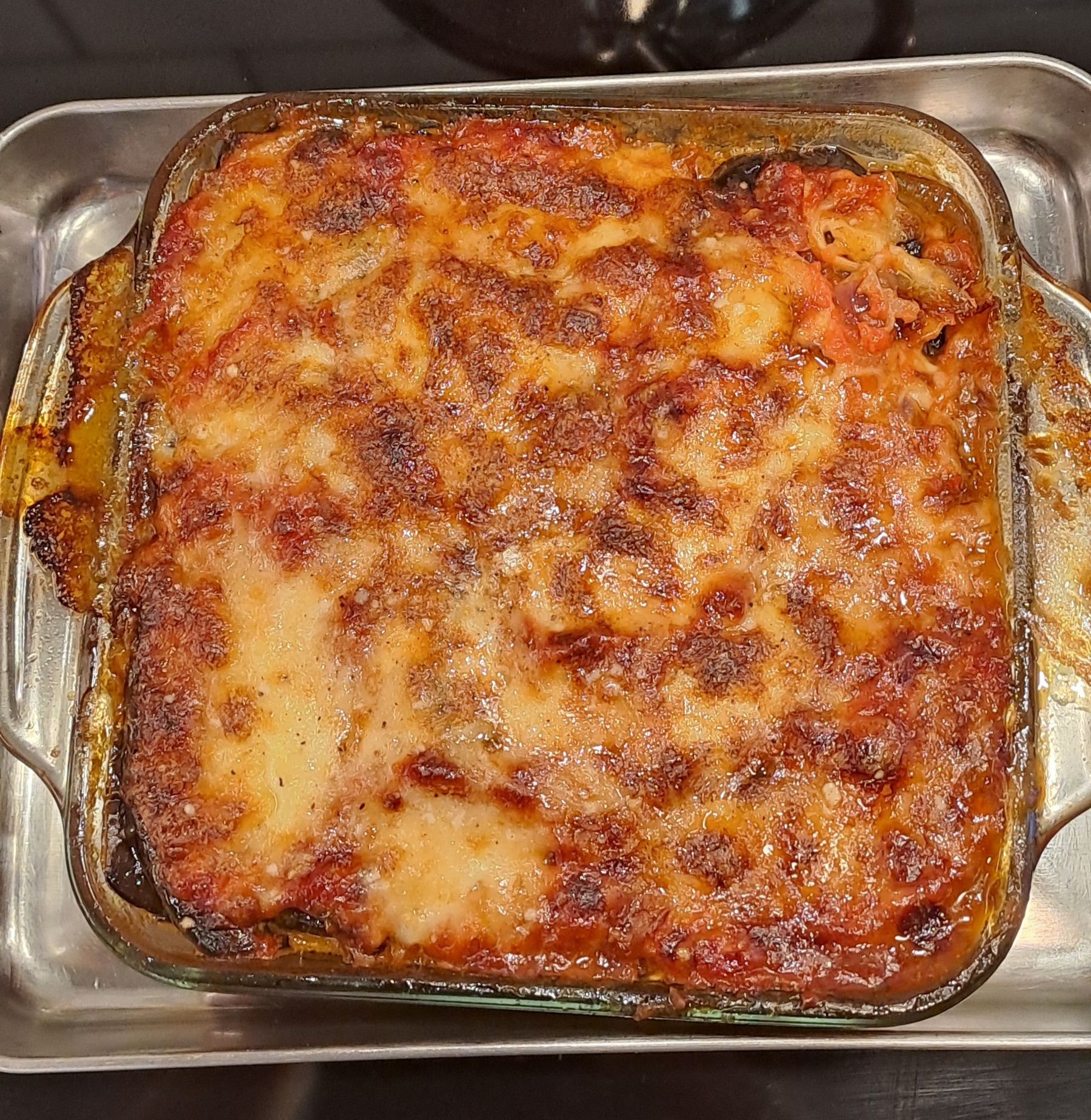 Heat your oven to 200ºC. Place the parmigiana on a middle shelf and cook for about 45 minutes until the top is bubbling and golden.