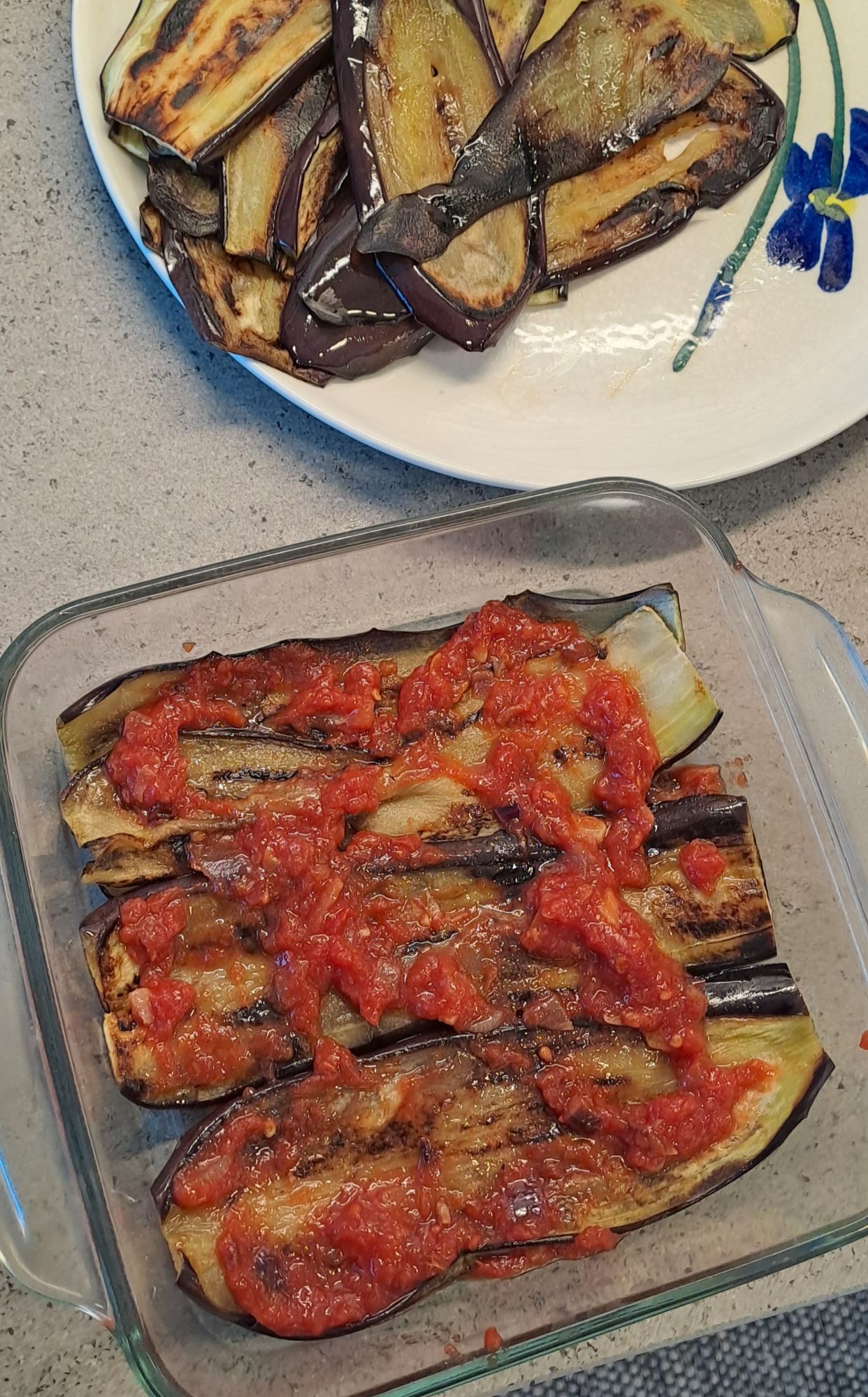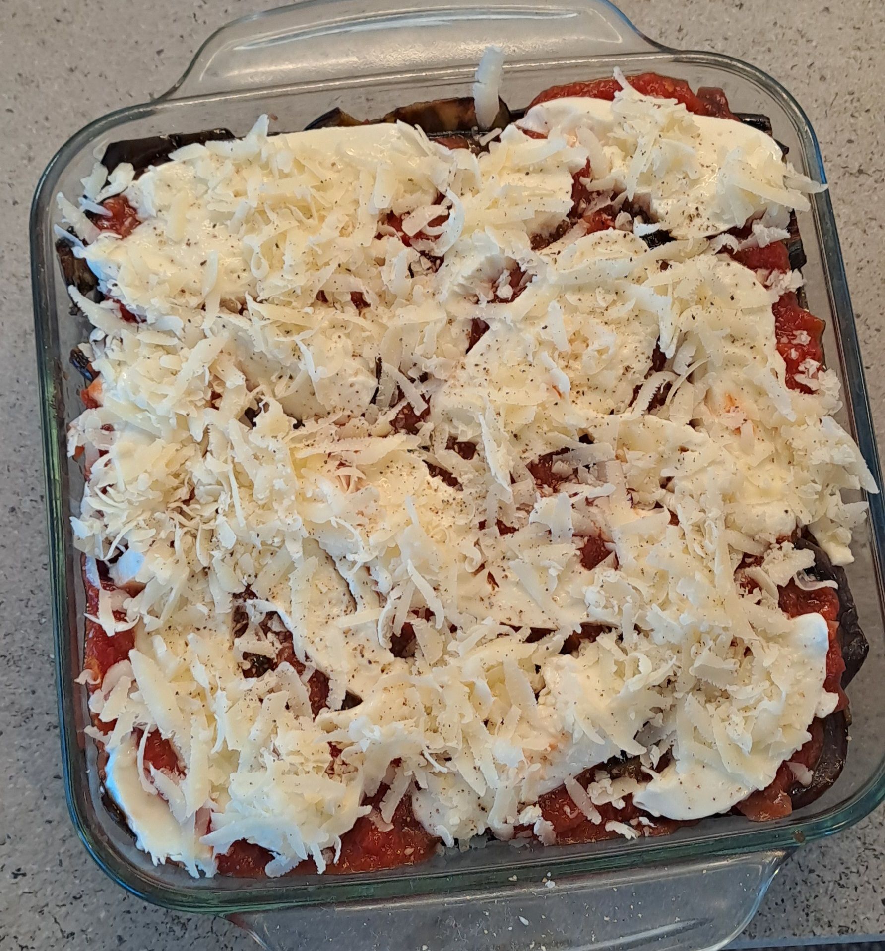 Continue adding layers of tomato sauce and aubergine until you have used everything. Aim to end with a layer of tomato sauce.