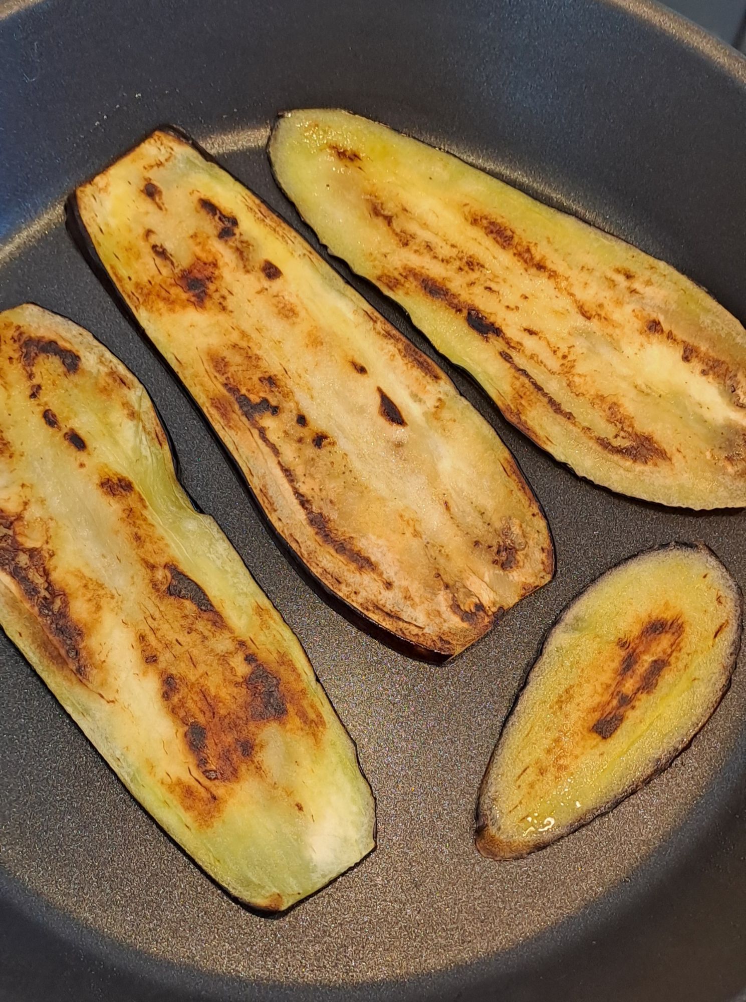 Brush the slices of aubergine with olive and fry until well done. This process will take a while as each slice has to be fried individually. Place cooked slices on a plate until needed for the bake.