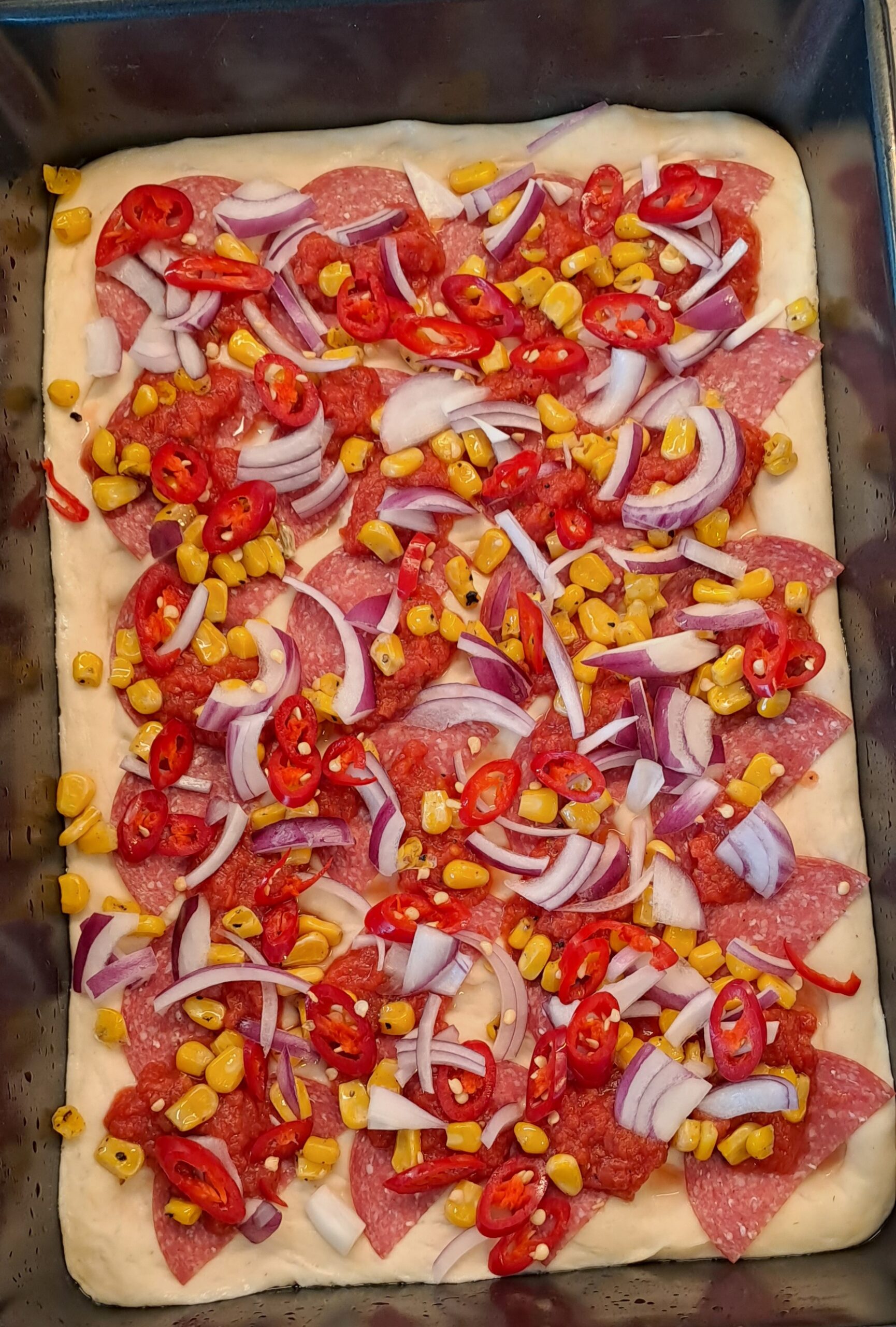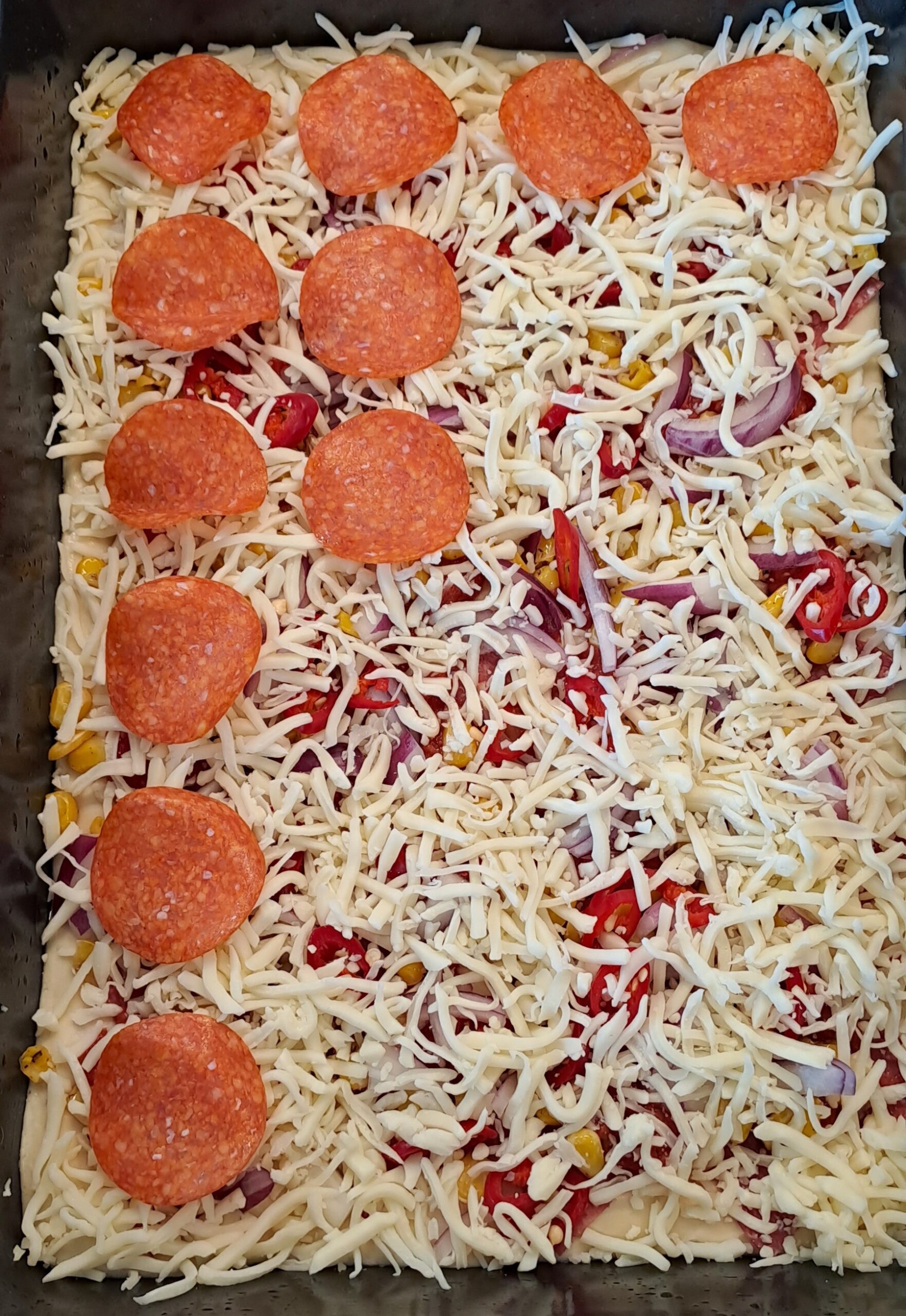 If using frozen dough make sure it is fully defrosted before starting. A black pan seems to create a better crust but a silver-coloured one will work fine. I used a pan measuring 34cm x 24cm. -