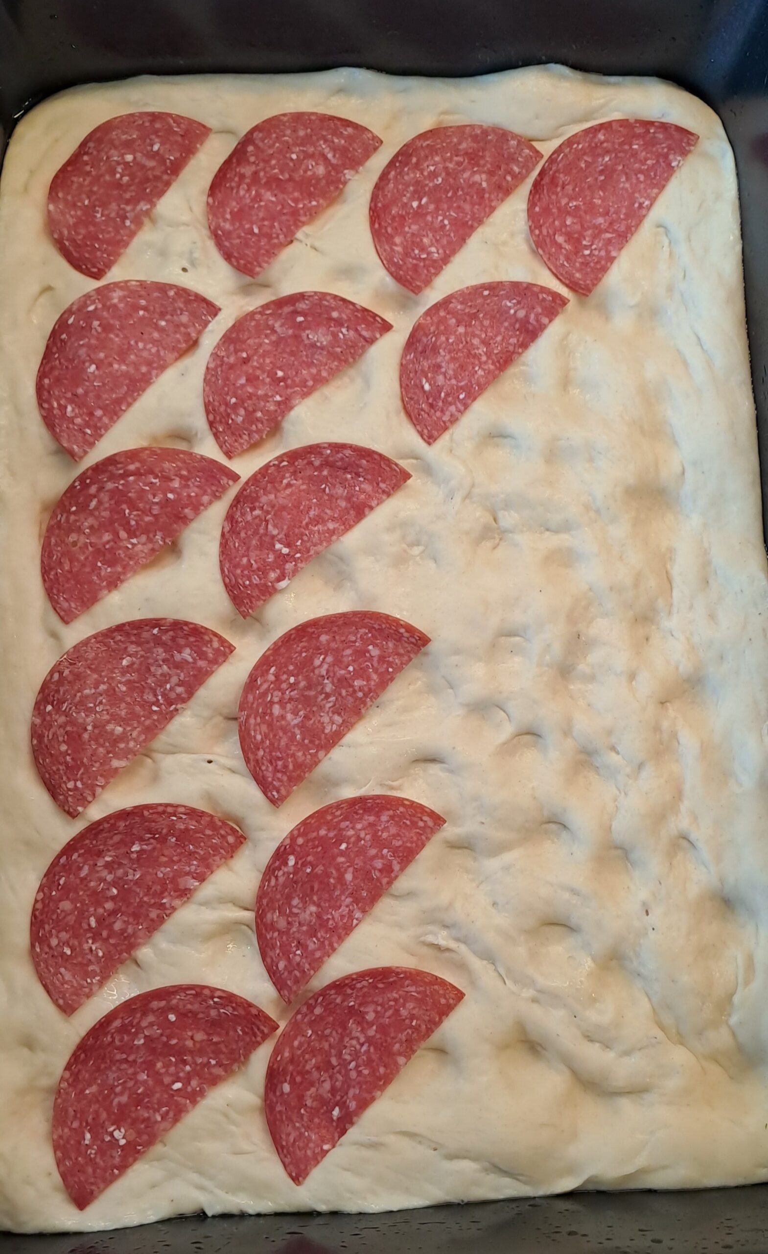 It's now time to dress the pizza. Start with the salami arranging the slices across the dough.
