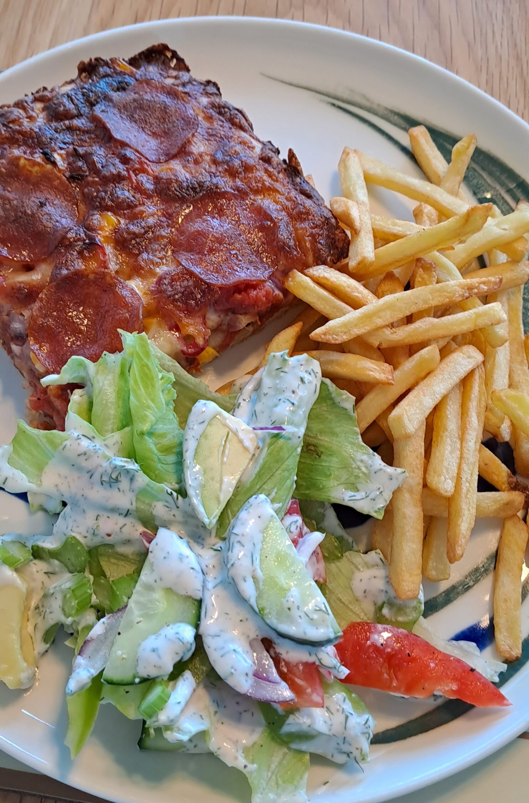 Bake for 20-25 minutes until the top begins to brown and the base sounds hollow when tapped. Serve with a mixed salad and chips.