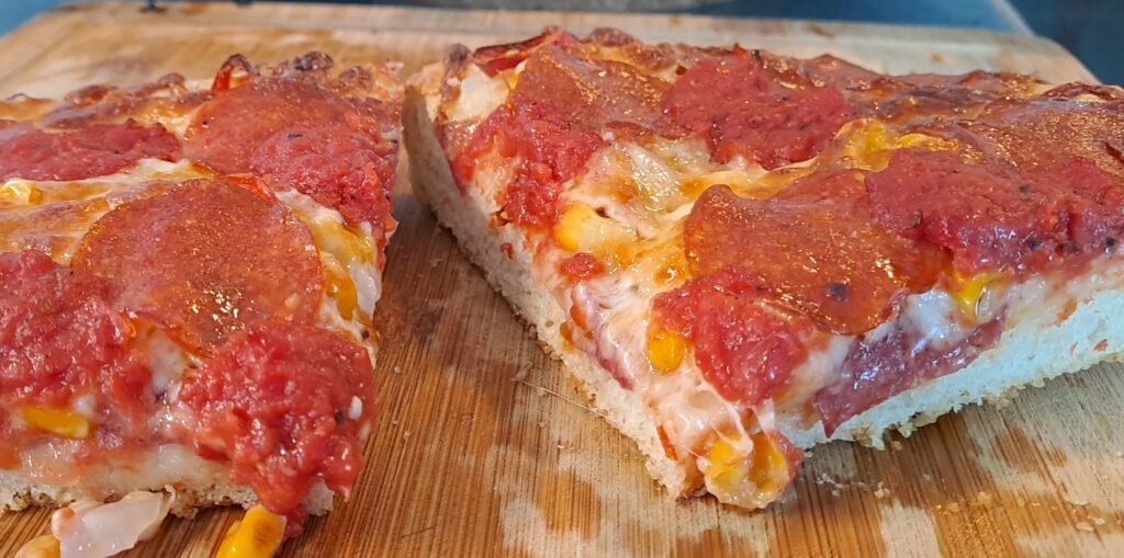 Deep pan pepperoni pizza is something that we can’t readily find at the moment as there is no Pizza Hut within easy distance. But that just pushed us to make our own recipe. After much experimentation, we’ve come up with this recipe for a great pepperoni and vegetable pan pizza which uses our standard pizza dough recipe.