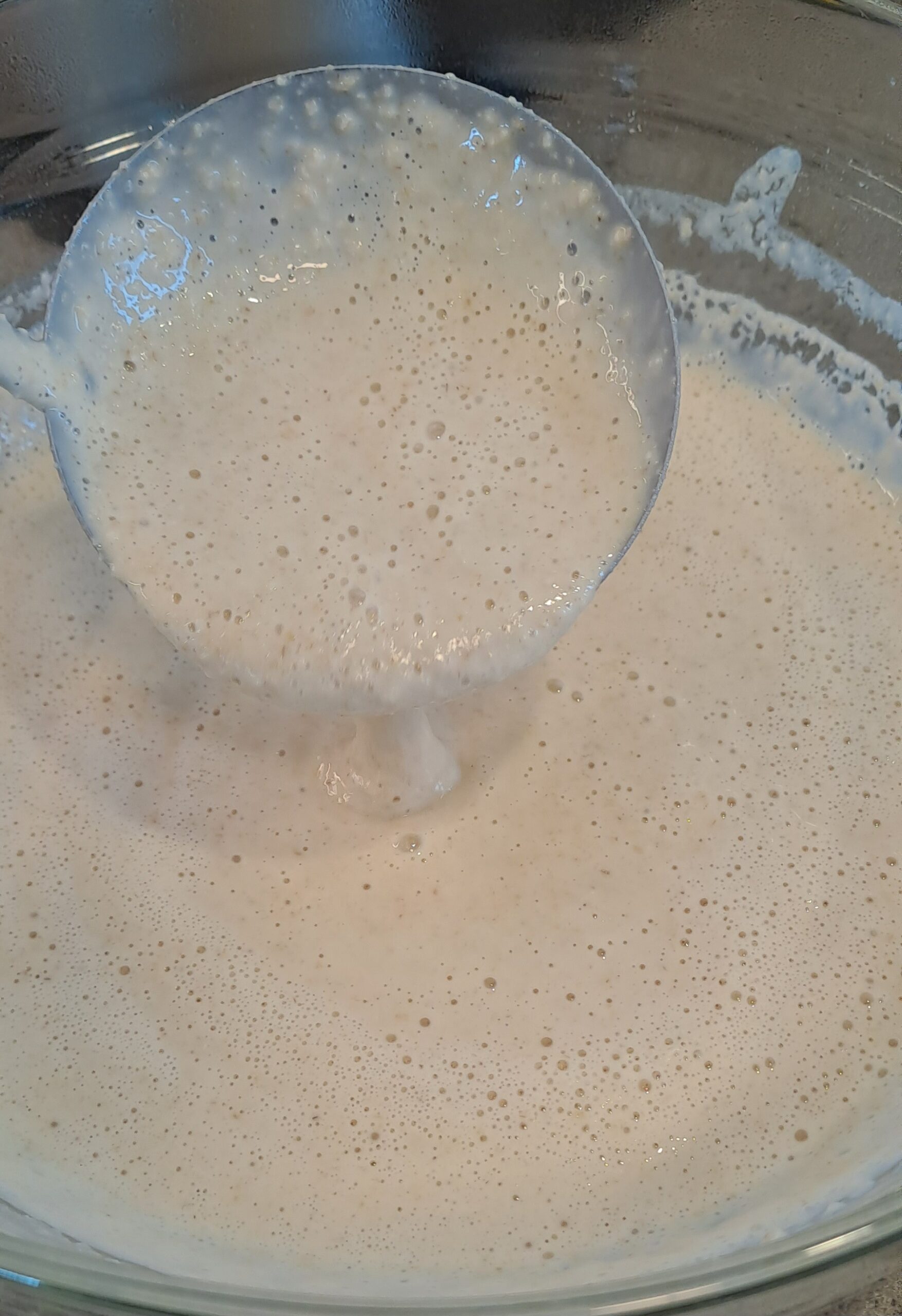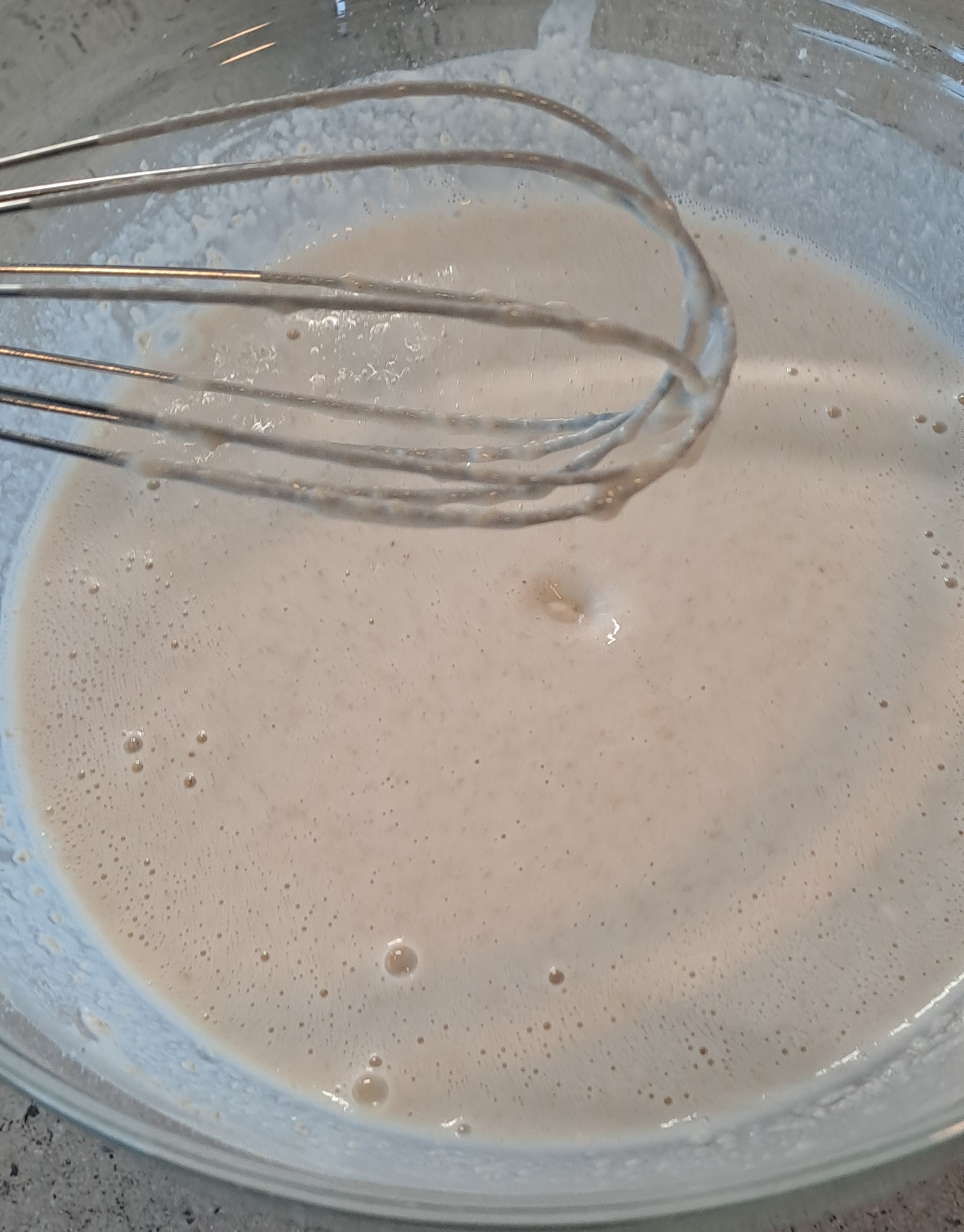 Add the milk/yeast mixture and whisk to form a thin-ish batter (the consistency should be similar to pancake batter). Leave to rise for at least 2 hours or up to overnight.