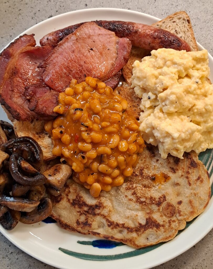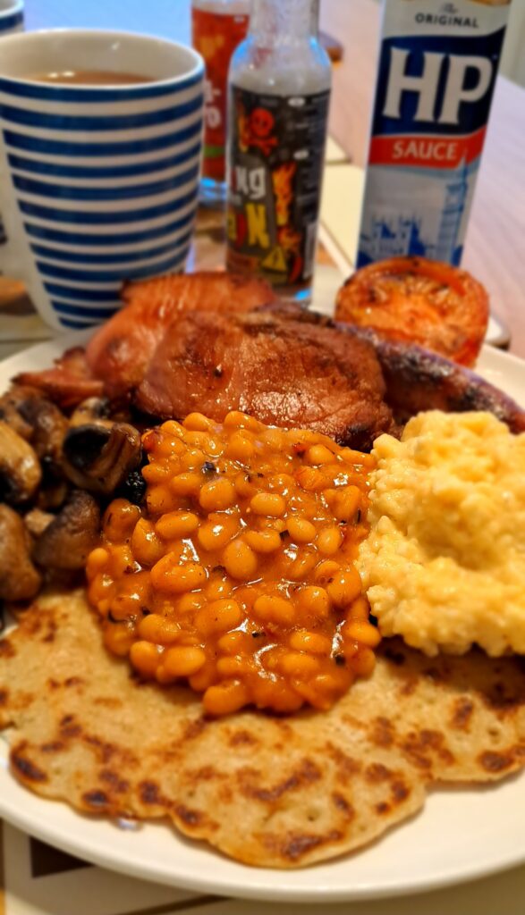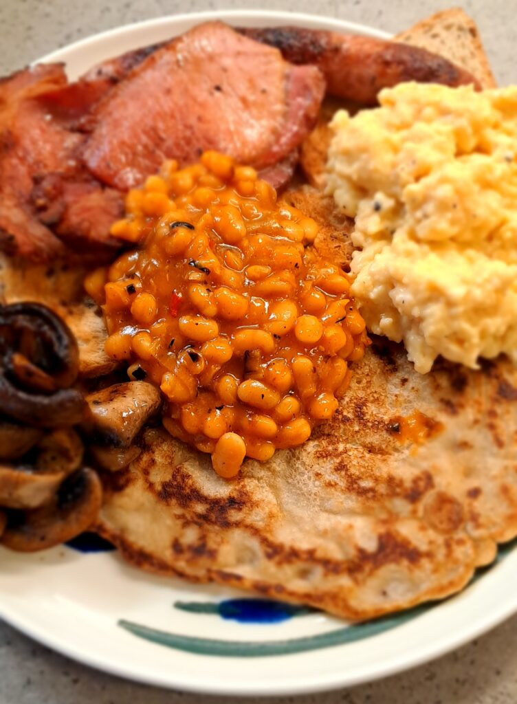 Place the oatcake on the dinner plate and put all the breakfast items on top so the juices can soak into the pancake. Enjoy with a cup of tea.