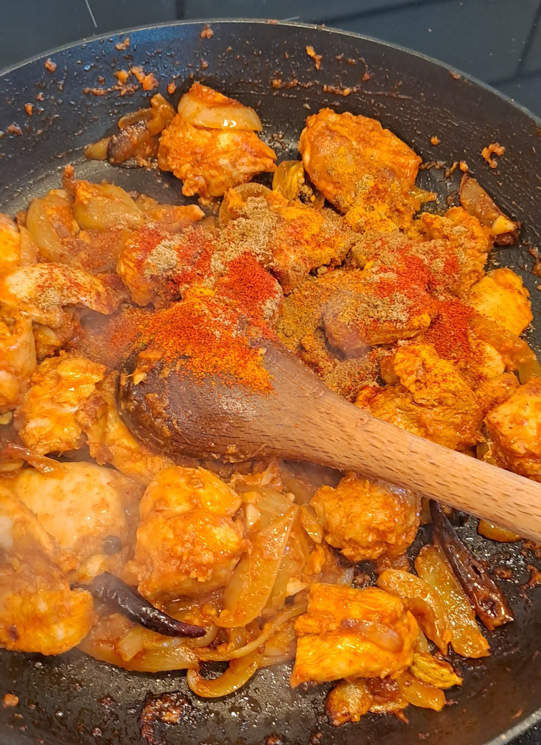 Remove the chicken from the marinade and add it to the frying pan. Fry until the chicken gains a little colour. Don’t worry about cooking the chicken through as it will cook in the sauce.