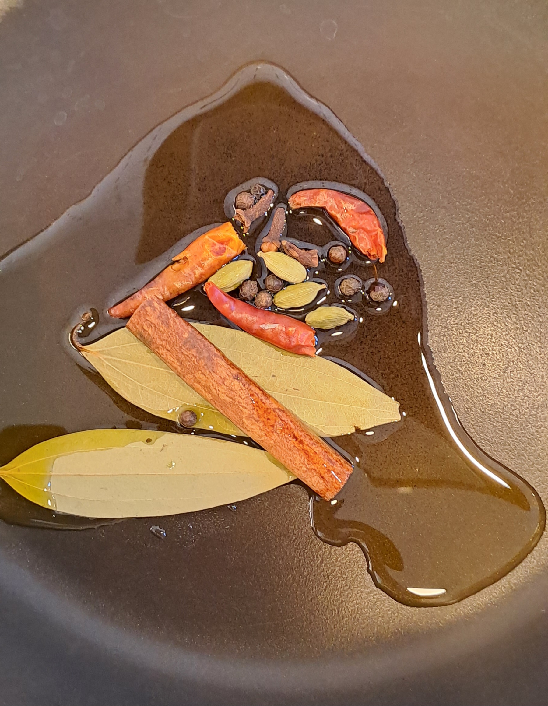Add the mustard oil, cinnamon stick, Indian bay leaves, whole peppercorns, cloves, green cardamom and dried chilies to a cold frying pan. Turn on the heat to medium and fry until the aroma starts to be released (waft the steam towards you to smell the change in aroma).