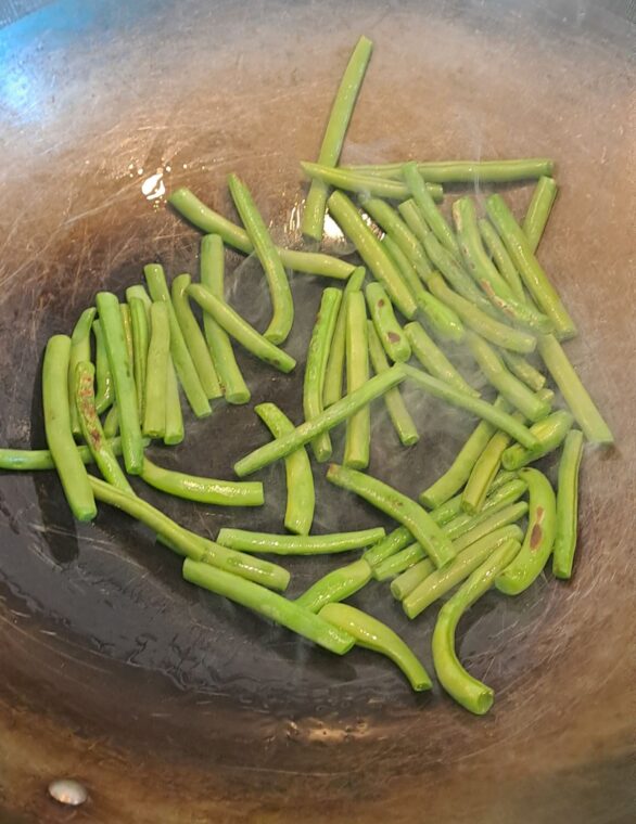 2. Add the green beans and stir fry for 5-6 minutes. Stir occasionally but leave the beans on the metal long enough to catch in places - this is where the unique flavour comes from.