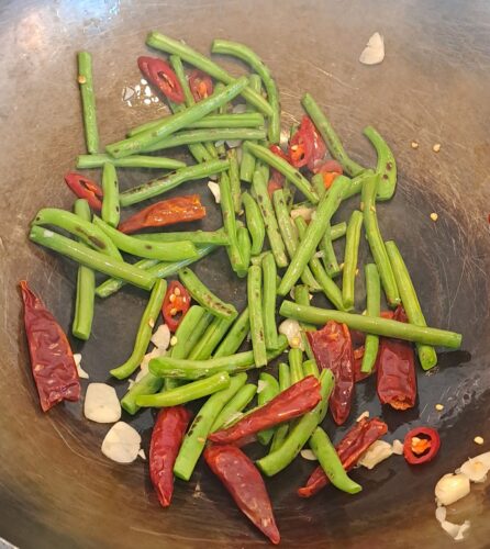 We first had dry-fried Sichuan green beans in Spicy Temptation in Rotterdam and were instantly hooked. They are more-ishly addictive and now form a key part of our Chinese dining experience.