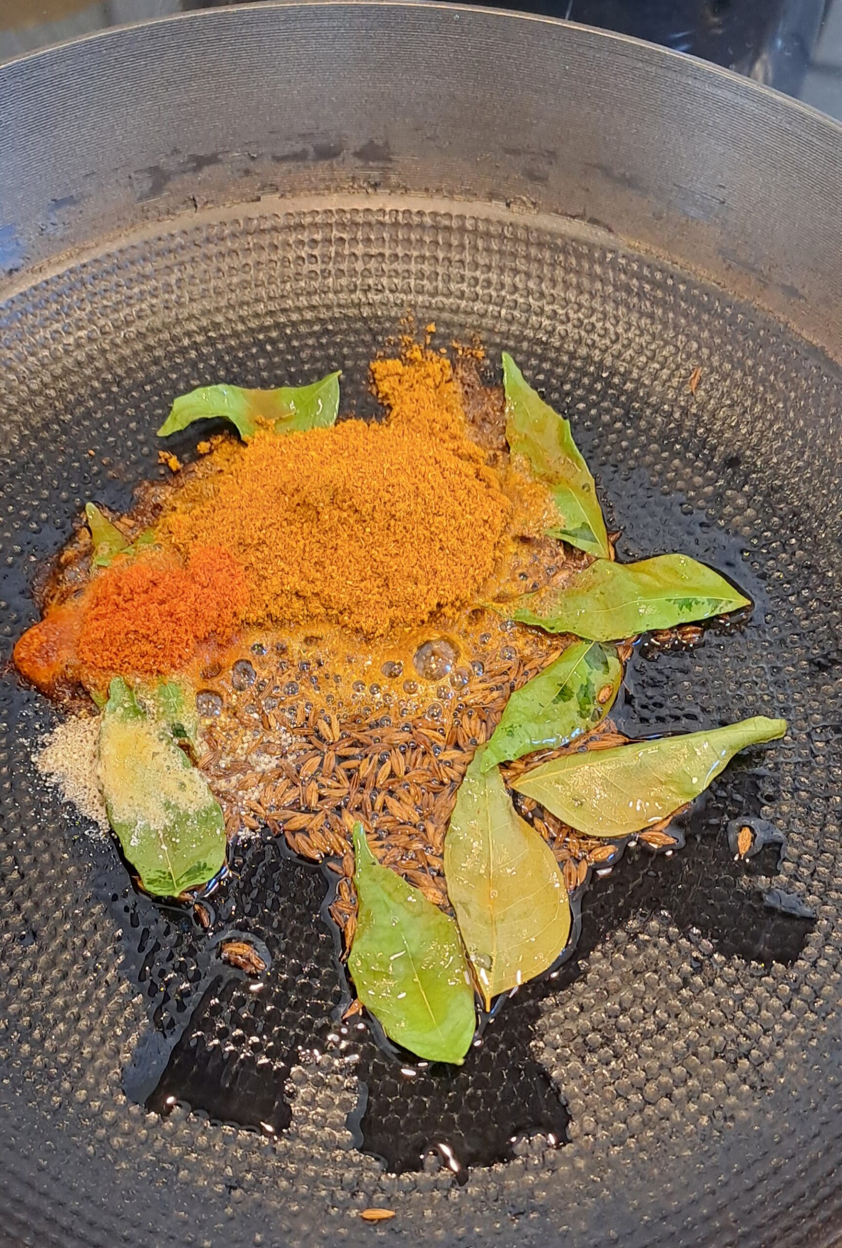 In a frying pan, add the vegetable oil, 8-10 curry leaves and 1 tsp of cumin seeds. Heat to a medium heat until the cumin seeds start to pop.