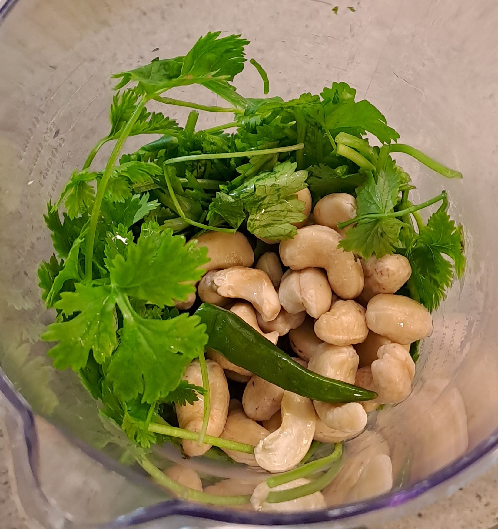 Put the coriander leaves, 2 chilis and the soaked cashew nuts including the soaking water into a blender. Blend until smooth.