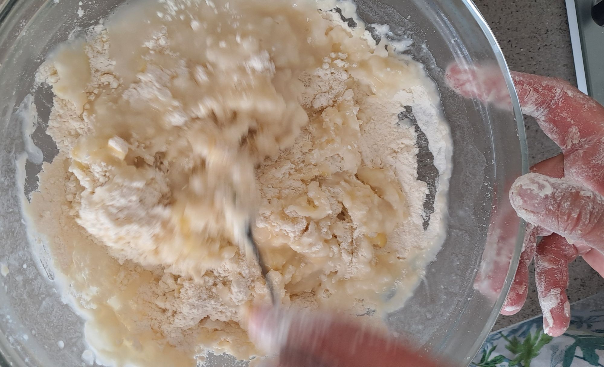 Pour in the just boiled water and quickly mix with a spoon. As soon as you are able use your hands to knead the dough for 3-5 minutes until a smooth dough is formed.