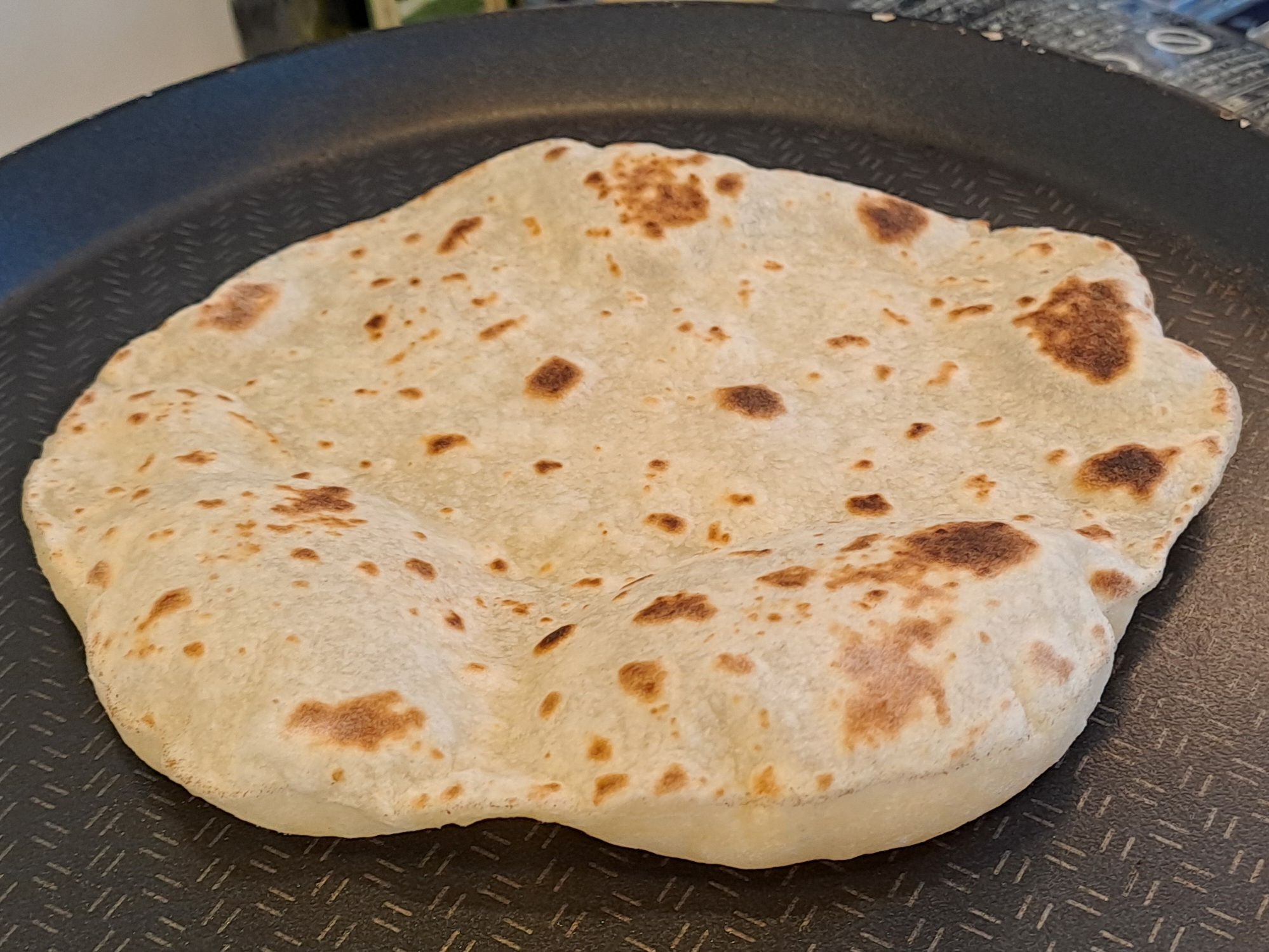 Heat a dry flat-bottomed pan over a medium heat. Place the dough circle in the pan and cook for 2-3 minutes until there are brown spots on the bottom.