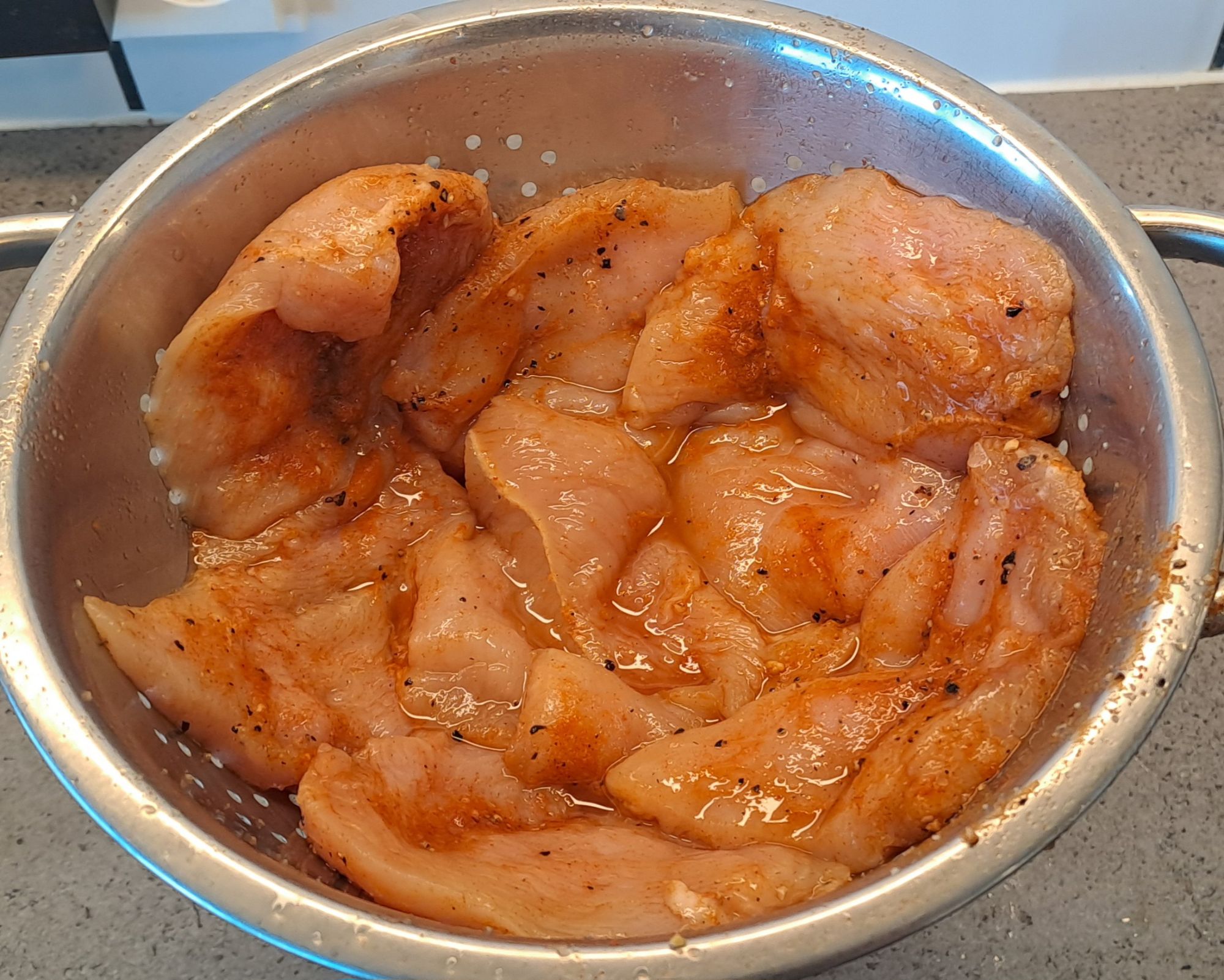 1. Remove the chicken from the fridge and empty into a colander. Spread the chicken out across the colander to ensure it can dry.