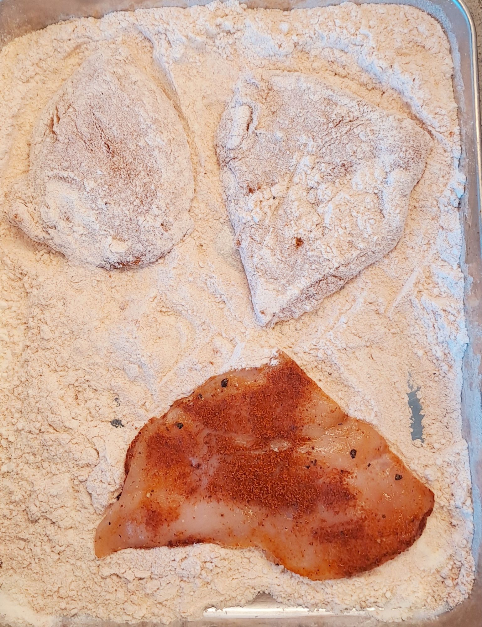 2. Dip the chicken in the flour mixture and pat to ensure the flour sticks to the chicken. Flip the chicken to make sure both sides are coated.