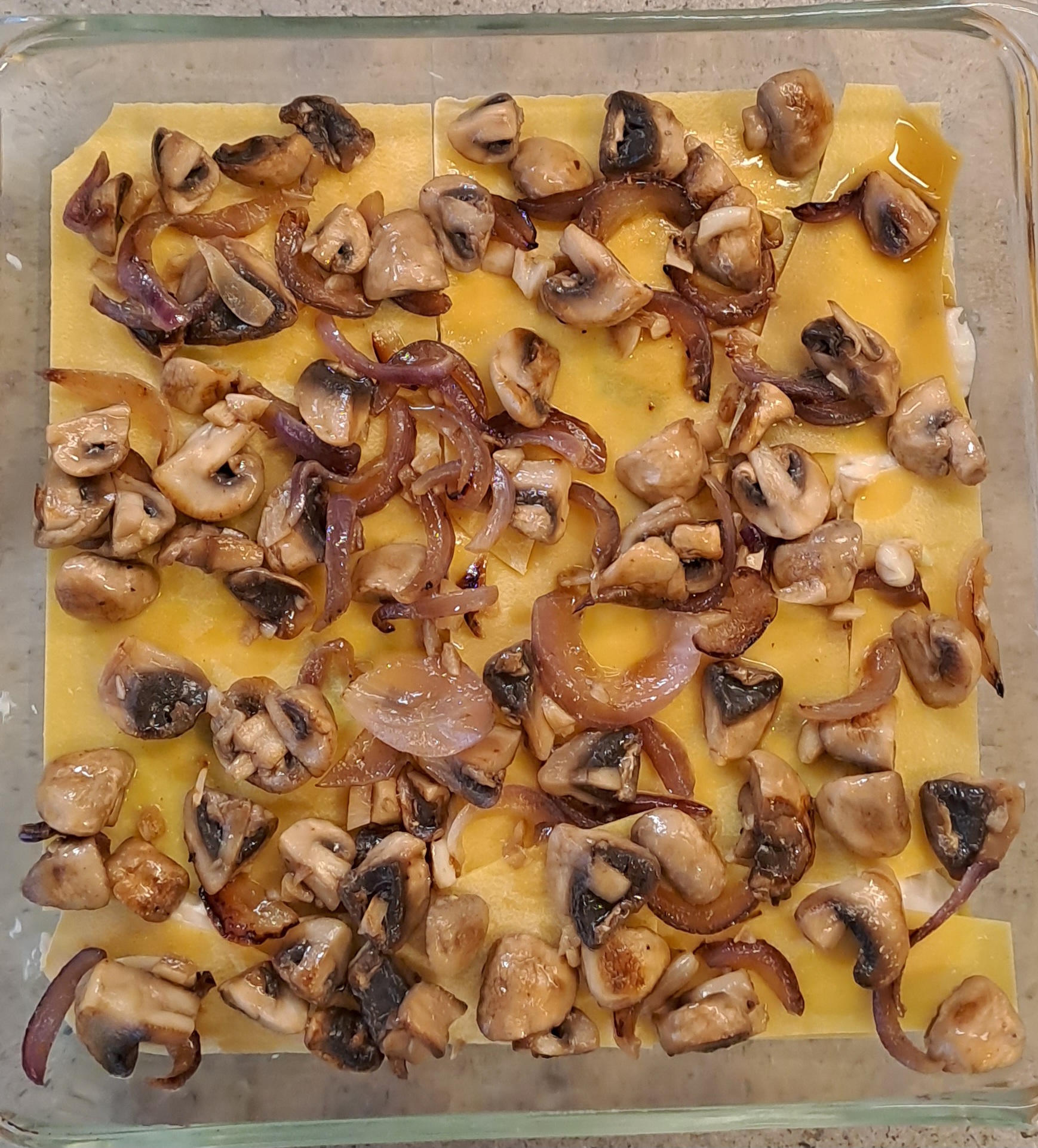 Spoon all of the mushrooms in one layer and add another layer of lasagne.