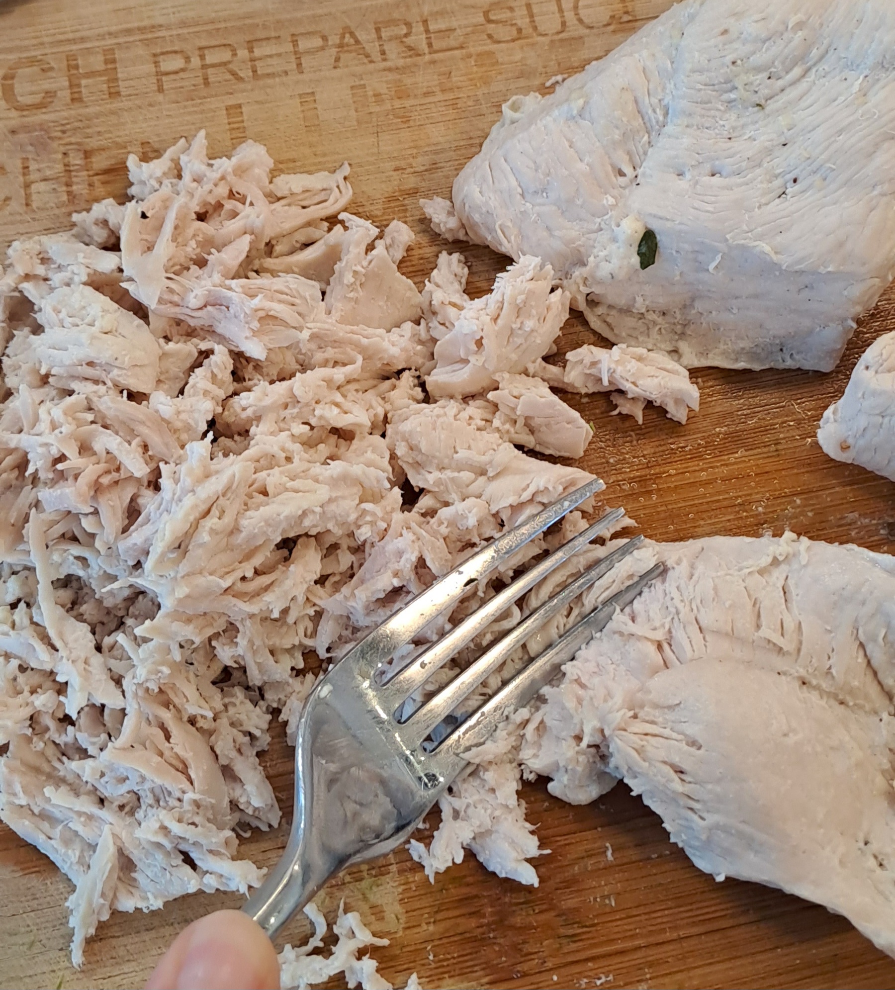 When the chicken has cooled a little shred it with a fork. Place to one side.
